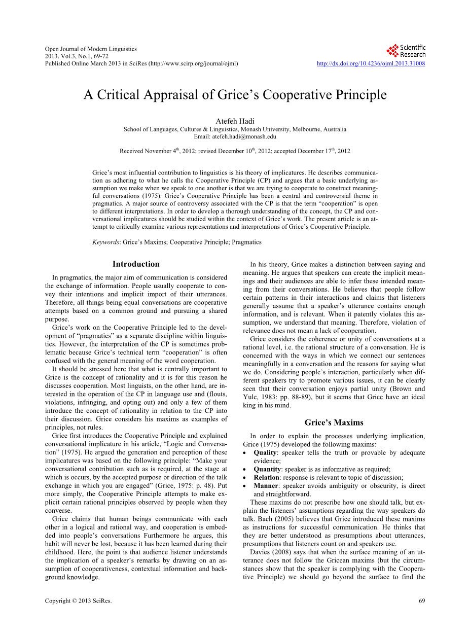 Grice对语言学最有影响力的贡献是他的言外之意理论。他所描述的沟通秉承着他所说的合作原则(CP),并且他认为,我们在与他人沟通时做着一个基本的潜在假设:我们努力合作以构建有意义的对话(1975年)。Grice合作原则一直是语用学的核心和语用学争议的主题。与CP相关的一个重要的争议原因是“合作”这个术语有着不同的解释。为了发展对概念的深入了解,对CP和会话含义的研究应该在Grice的理论范围内展开。本文章尝试严格审查对Grice合作原则的各种陈述和解释。