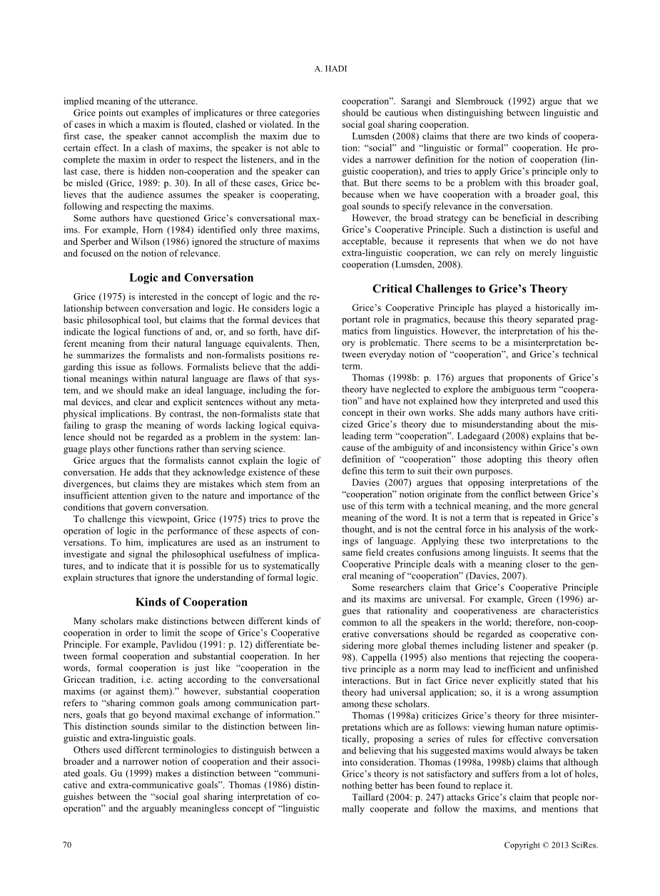 Grice对合作原则的研究使“语用学”作为语言学中的一个独立学科得到发展。但是,CP的解释有时是有疑问的,因为格莱斯的技术术语“合作”往往与一般字面上的合作的含义相混淆。