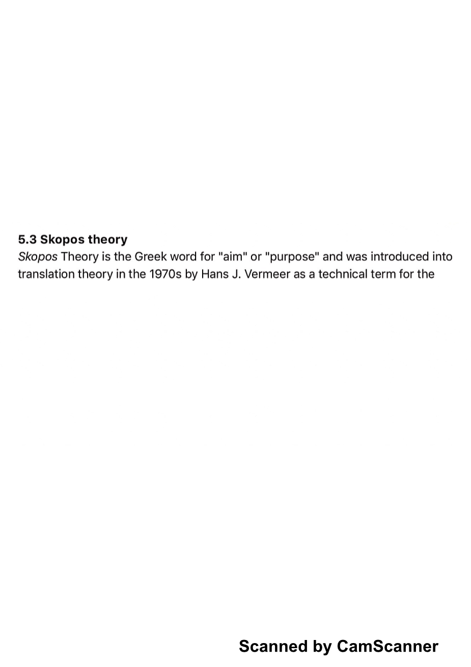 Skopos在希腊语中的意思是“目标”或“目的”,汉斯·J·维米尔将其作为专业术语引入翻译理论当中,以表示译作或翻译行为的目的。功能翻译理论(Skopostheorie)的主要著作是维米尔和卡特雷纳·赖斯合著的《通用翻译理论基础》。虽然功能翻译理论的提出要早于霍尔兹·曼塔利的翻译行为理论,但也可视为翻译行为理论的一部分,这是因为功能翻译理论关注的是以原文为基础的翻译行为,而这一行为需要经过协商和实行,并且需要兼备目的和结果(维米尔,1989/2000:221)。功能翻译理论的首要关注是目的,这个目的决定了译者需要采用何种翻译方法和策略,才能产生功能上可满足需要的结果。这项结果就是译文,维米尔称其为translatum。所以在功能翻译理论中,译者必须清楚为什么要翻译原文,以及目的语文本的功能。
