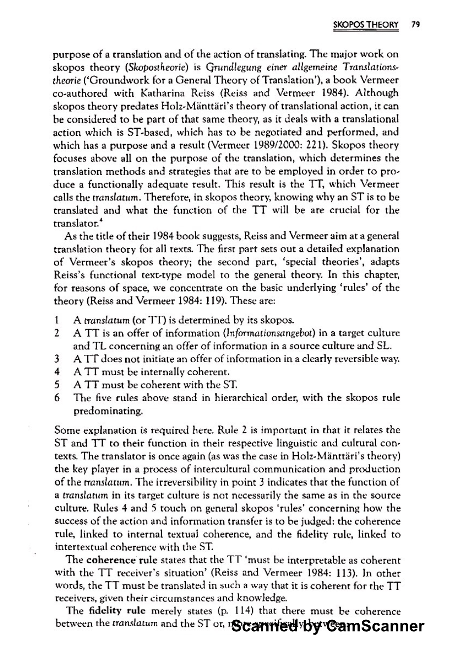 这里还需要做一下解释。第2条规则很重要,因为它将原文和译文与它们分别在各自语言和文化语境中的功能联系了起来;译者再一次(如同霍尔兹·曼塔利的理论中那样)成为了跨文化传播和译文生产过程中的关键参与者。第3条规则的不可回译性显示,译文在目的语文化中的功能并非一定要等同于原文化中的功能。第4和第5条规则涉及了通用目的“规则”,即怎样评判翻译行为和信息传递成功与否:与文内连贯相关的连贯规则,和原文的文本间的连贯则与忠实规则相连。