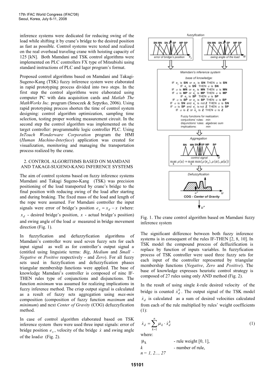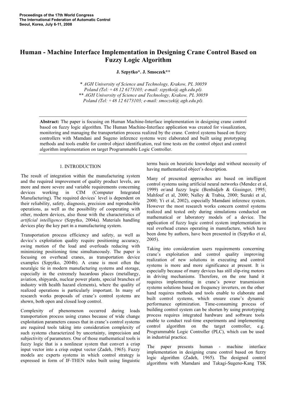 本文介绍了基于模糊逻辑算法设计起重机控制的人机界面实现(Zadeh,1965)。设计的控制算法与Mamdani和Takagi-Sugeno-Kang TSK于2008年7月6 - 11日韩国首尔2008年7月6 - 11日第17届世界大会议事录国际自动控制联合会,推断系统专用于减少负载的摆动,同时通过起重机桥将其尽可能快地移动到期望的位置。控制系统在具有125 [kN]起重能力的实际桥式起重机上进行测试和实现。Mamdani和TSK控制算法均使用PLC和Lager程序格式的标准指令在三菱PLC的FX类型上实现。提出了基于Mamdani和TakagiSugeno-Kang(TSK)模糊推理系统的控制算法,在快速原型过程中分为两个步骤。在第一步中,使用具有数据采集卡的计算机PC和Matlab MathWorks公司程序(Smoczek&Szpytko,2006)详细阐述了控制算法。使用快速原型过程缩短了控制系统设计的时间:控制算法优化,采样时间选择,测试适当的工作测量电路。在第二步中,在目标控制器上实现控制算法:可编程逻辑控制器PLC。使用InTouch Wonderware公司对HMI进行编程(人机界面)应用程序,用于可视化,监控和管理由起重机实现的运输过程。