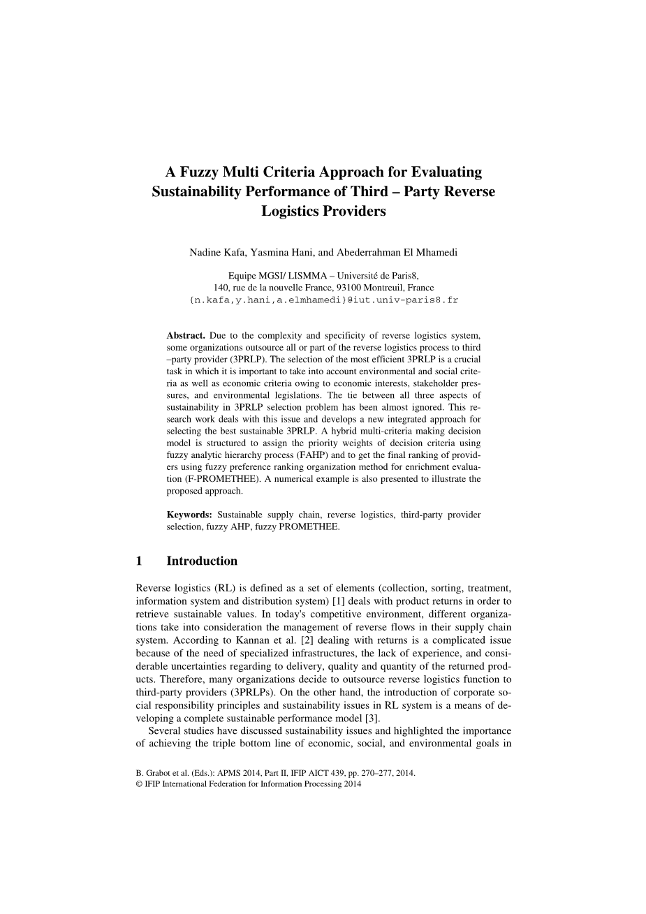 下一节介绍了混合模糊层次分析-多属性决策法来评价第三方逆向物流供应商的可持续发展绩效;第三节举例说明并进行结果分析;最后文章得出结论。