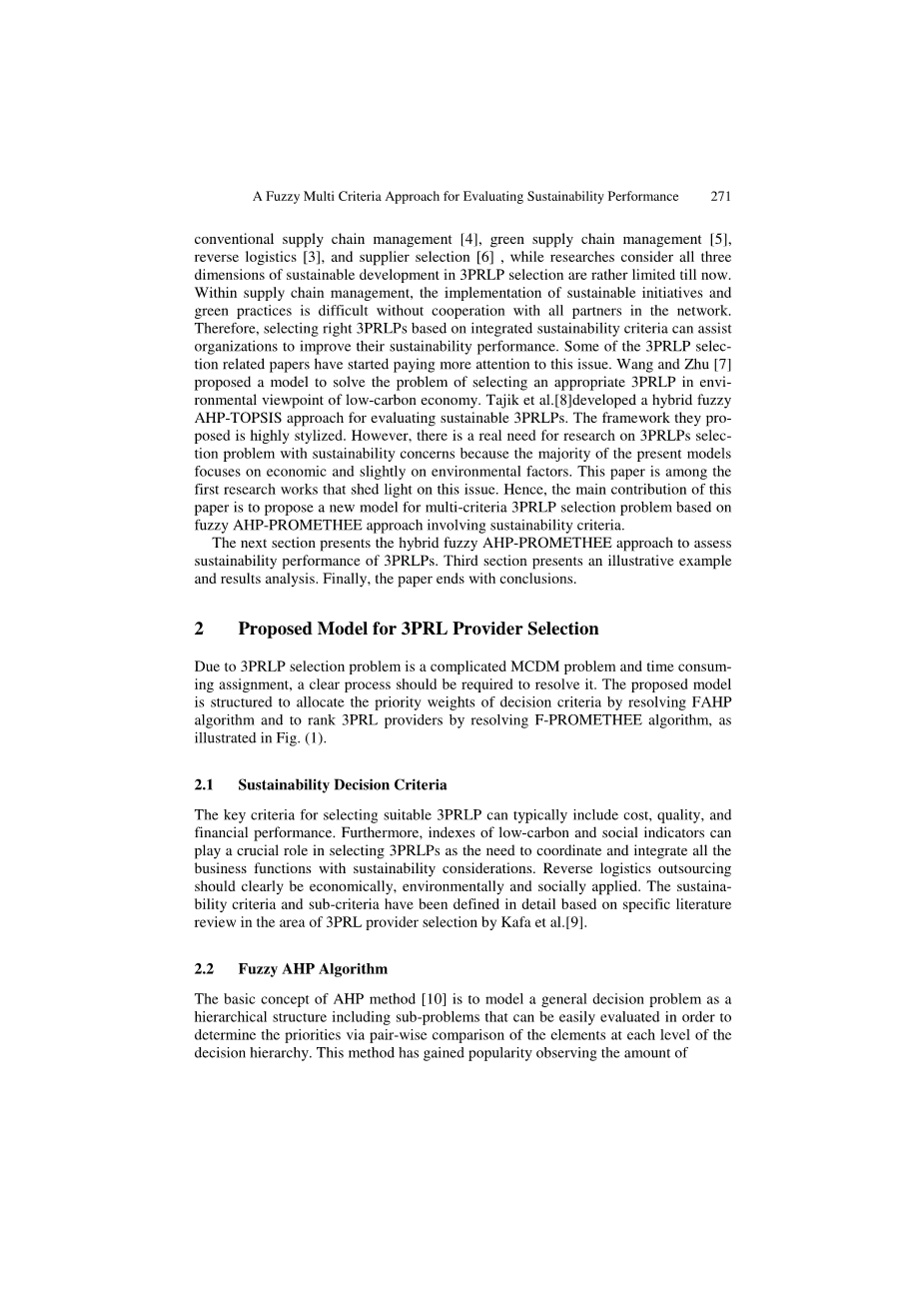 一些研究讨论了可持续性问题,并强调了在传统供应链管理[4],绿色供应链管理[5],逆向物流[3]和供应商选择[6]中实现经济目标、社会目标和环境目标三重底线的重要性,虽然研究认为第三方逆向物流供应商选择中可持续发展的三个维度至今都是相当有限的。在供应链管理中,如果没有与网络中的所有合作伙伴合作,实施可持续举措和绿色实践就很困难。因此,根据综合可持续性标准选择正确的第三方逆向物流供应商可以帮助组织提高可持续发展的绩效。一些与第三方逆向物流供应商选择相关的论文已经开始关注这个问题。Wang和Zhu [7]提出了一个模型用来解决在低碳经济环境下选择合适的第三方逆向物流供应商的问题。塔吉克等[8]开发了一种混合模糊AHP-TOPSIS方法来评估可持续的第三方逆向物流供应商,他们提出的框架是高度程式化的。然而,对可持续发展条件下的第三方逆向物流供应商选择问题的研究仍然存在确切的需求,因为目前的大多数模型都过于注重经济因素而对环境因素考虑甚少。本文是关于这个问题的首批研究成果之一。因此,本文的主要贡献在于为多目标的第三方逆向物流供应商选择问题提供了一个涉及可持续标准、基于混合模糊层次分析-多属性决策法的新模型。