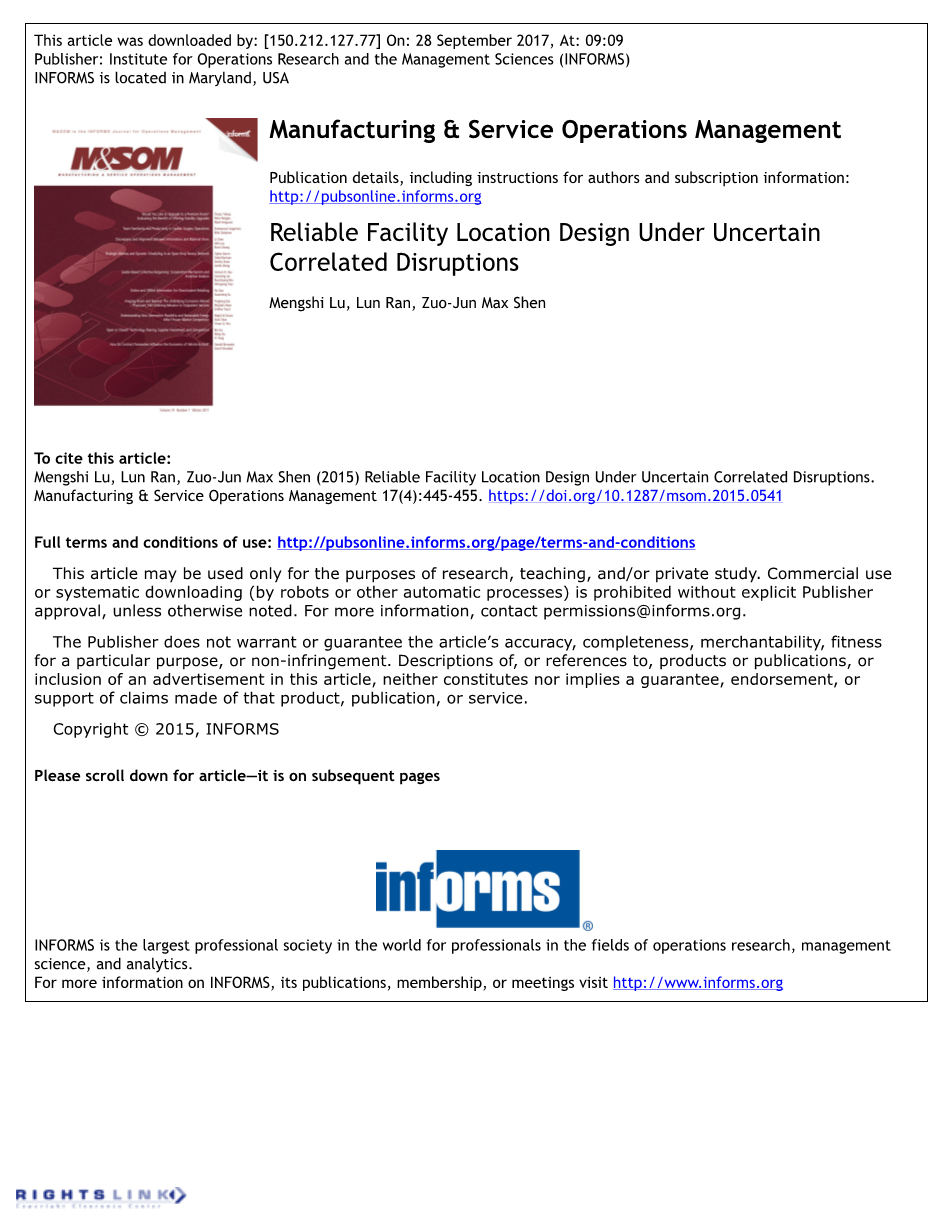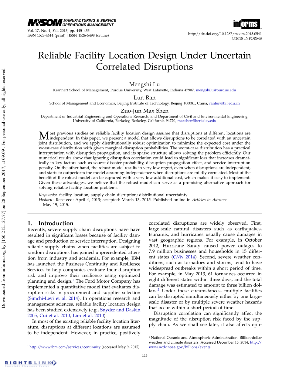最近,由于设备损坏和生产或服务中断,严重的供应链中断造成了重大的损失。在设施受到随机干扰的情况下设计可靠的供应链,引起了业界和学术界的空前关注。例如,IBM推出了业务连续性和弹性服务,以帮助企业评估其中断风险,并通过优化规划和设计提高其弹性。福特汽车公司实施了一种量化模型,评估采购和供应商选择的中断风险(Simchi-Levi 等,2014)。在运营研究和管理科学领域,可靠的设施定位设计已经被广泛的研究(例如,Snyder and Daskin 2005,Cui 等2010,Lim 等2010)。