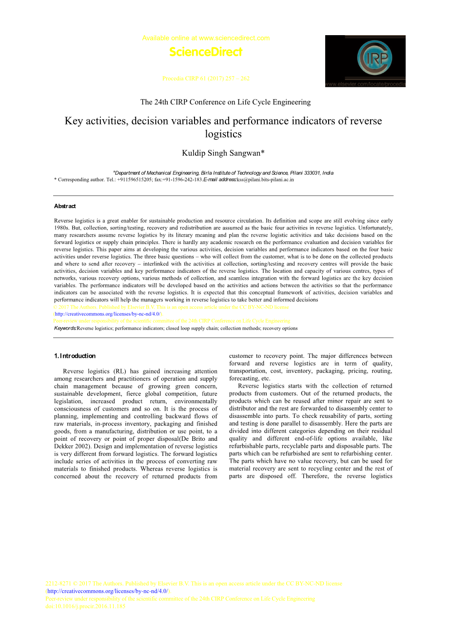 由于绿色关注,可持续发展,激烈的全球竞争,未来的立法,增加的产品回报,客户的环保意识等,逆向物流(RL)在运营和供应链管理的研究人员和从业者中越来越受到重视。 这是一个规划,实施和控制原材料,在制品库存,包装和成品从制造,分销或使用点到恢复点或适当处置点的落后流程的过程(De Brito and Dekker 2002)。 逆向物流的设计和实施与正向物流有很大的不同。 远期物流包括将原材料转化为成品的一系列活动。 而逆向物流则关注退货产品的回收