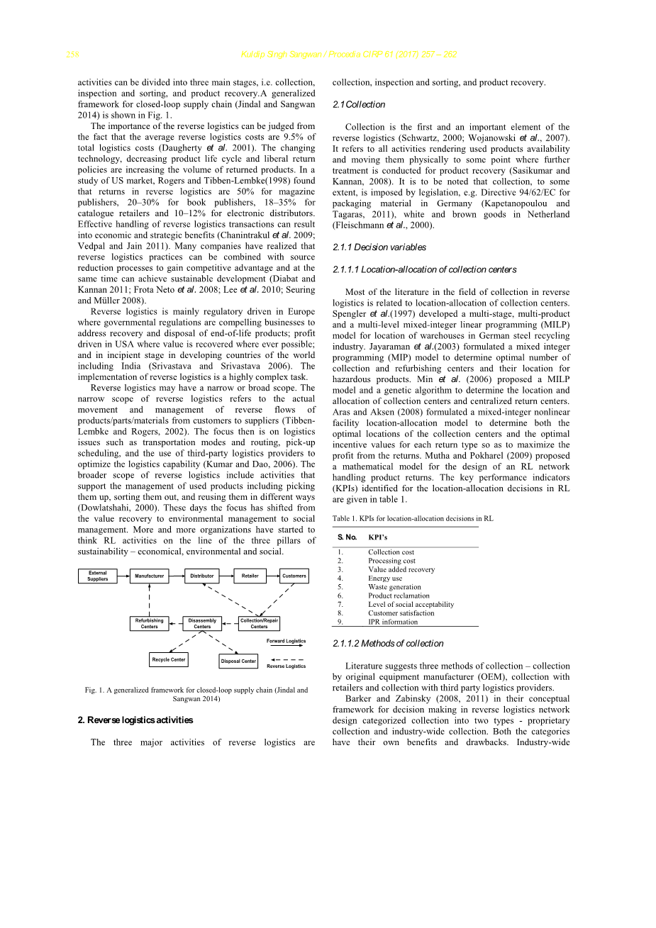 收集系统具有规模经济优势,不会使公司的前向供应链复杂化。 但是,个别公司对这种收集系统的控制有限。 如果公司与客户之间有很强的直接关系,例如租赁回报关系,或者当客户有很高的折价行为时,专有的收款系统是特别有利的。 然而,运输成本可能更高,因为公司特定的系统不能利用规模经济。 Jindal和Sangwan(2015)使用模糊数学评估了Savaskan等人(2004)提出的三种替代收集方法,发现除了初始投资标准,价值之外,最合适的收集方法还取决于产业类型和收集规模增加回收量,回收量,运营成本,供应链控制程度和客户满意度水平。 表2给出了用于在RL中收集决策的关键绩效指标。