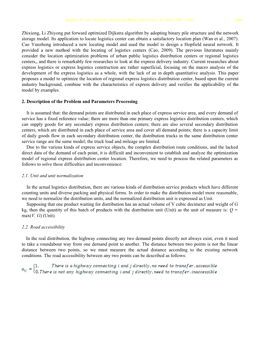 签署惯例如下: aij 共同执行活动:可访问性可变性。如果是 aij=1 ,它存在直接连接的道路之间点i和点j,如果 aij=0,则在i和j之间不存在直接连接的道路; bksij : If bksij 1,则是从k到二级快速分布中心S的最短路径, if bksij=0 ,则它不是shdortest路径;CIJ:单价从一级快车配送中心到二级快车配送中心j;ij:从点i至点j;dj:点j的要求;fi:备选二级快速配送中心的固定费用(包括资本投资和固定经营成本);g:二级快件流通单价i中心(一个单位流量的管理费和储存费用);hij:从第一点到第一点的分配价格点:L:从1级快递配送中心I到2级快递配送中心J的距离;LeN:从2级快递配送中心到DEMA的最大里程限制 直接点;m:2级快车配送中心的备选地点数;Mi:备选2级的设计能力快递配送中心i;n:需求点数;p:二级快递最大数量。可建配送中心;r:一级快递配送中心数量;X k:运输量。从二级特快配送中心到需求点k;配送中心一至二级快递配送中心j;WiJ:一级快车的运输量紫:二级快递配送中心的变数位置,如果ZI=1、需求点一是二级快运配送中心,如ZI=0是子的话。需求点i不是2级快递配送中心;成本:配送网络总成本。