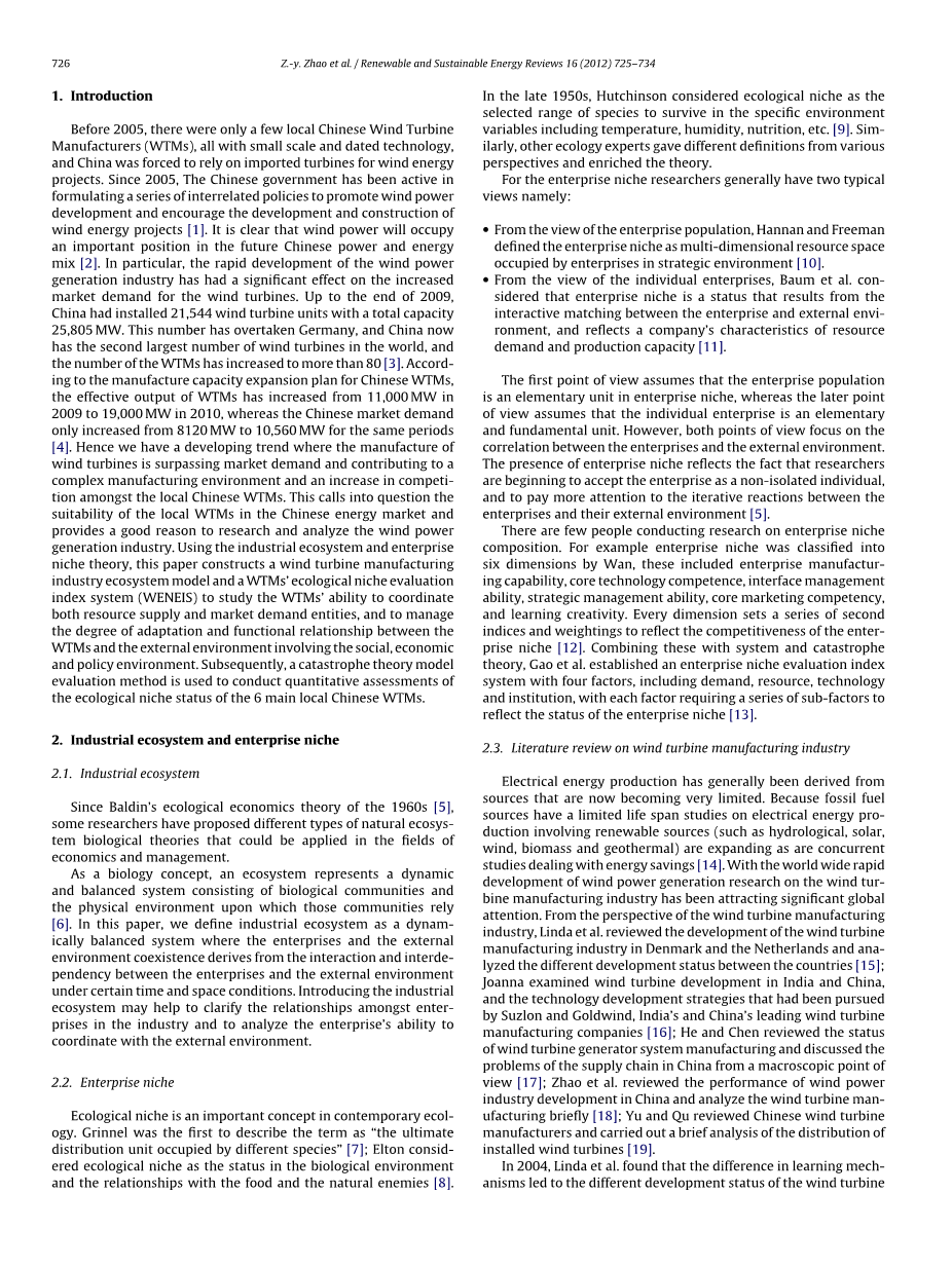 在2005年之前,中国的风力发电机只有少数几家制造商(WTMs),都具有小规模和过时的技术,中国被迫依靠进口的风力涡轮机项目。自2005年以来,中国政府一直活跃于中国制定一系列促进风电相互关联的政策发展和鼓励发展和建设风能项目[1]。很显然,风电将占据未来中国能源和能源的重要地位混合[2]。特别是风电的快速发展新一代产业对增长产生了显着影响市场对风力涡轮机的需求。截至2009年底,中国已经安装了21,544台总容量的风机25,805兆瓦。这个数字已经超过了德国和中国世界上风力涡轮机数量第二多,而且WTM的数量增加到80多个[3]。根据到中国WTM的制造能力扩展计划,WTMs的有效产量已从2006年的11,000 MW增加到2008年的11,000 MW2009年达到19,000兆瓦,而中国市场需求量同期仅从8120兆瓦增加到10560兆瓦[4]。因此,我们有一个发展趋势,制造风力发电机组正在超越市场需求,并为风力发电机组做出贡献复杂的制造环境和竞争加剧当地的中国WTM。这引起了对此的质疑当地WTMs在中国能源市场和地方的适宜性为研究和分析风电提供了很好的理由新一代产业。使用工业生态系统和企业利基理论,构建风力发电机制造。