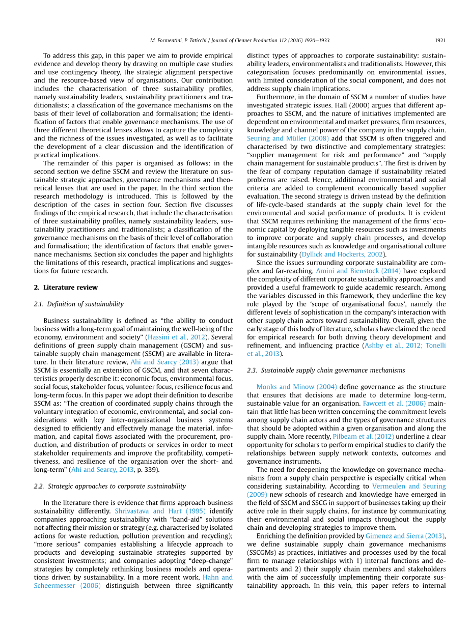 相关文献证明,企业将可持续性和三重底线方法(哈恩和施来米希尔,2006)以不同方式(博肯等人,2013)植入自身企业模型, 制定短期和长期计划(爱泼斯坦,2008),测量业绩(泰特等人,2013)。为了实施和控制可持续策略及方案,本着改善可持续性能的终极目标,企业建立了治理机制和管理结构以管理与供应链一方的关系(吉梅内斯和利泽,2012)。考虑其相关性,可持续供应链管理(SSCG)领域研究(梅尔沃郎,斯沃林,2009)开始关注治理机制在供应链管理中的作用。可持续供应链管理文献的早期研究强调了协作方法和不同水平的治理机制正规化的作用(阿尔瓦雷斯等人2010)。然而,可持续供应链管理的一些方面仍旧不明确。比如,可瓦斯(2008)呼吁企业,通过强调理解上游和下游需求,审视环境和社会责任;科特和易斯顿(2011)指出,人们需要更好地理解供应链管理结构如何受可持续性策略影响,尤其要注意签约问题。虽然研究提供了一些框架(如范博梅尔,2011;沃尔等人,2009)用于研究治理机制之间的关系,但只有少量的实证证据可以表明可持续性策略和管理模式如何有效地应用于实践,和治理机制共同发挥作用。