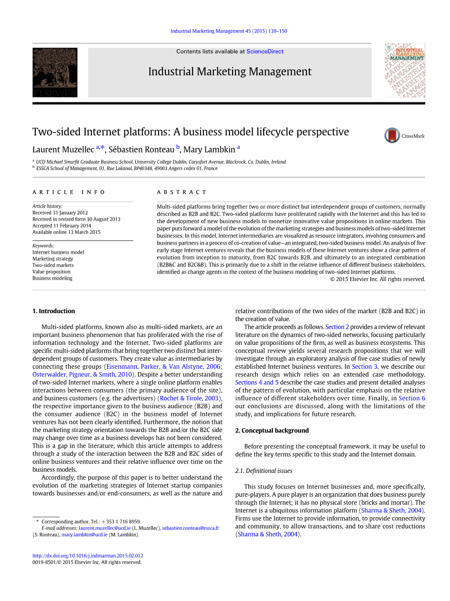 多边平台,也称为多边市场,是一个随着信息技术和互联网的崛起而激增的重要的商业现象,双边平台是特殊的多边平台,汇集两个不同但相互依存的客户群。他们通过这些群体之间的中介机构创造价值(Eisenmann Parker和Van Alstyne,2006;Osterwalder,Pigneur和 Smith,2010). 尽管一个更好的双边互联网市场的理解,在一个单一的在线平台,使消费者之间的相互作用(该网站的主要受众),和企业客户(如广告)(Rochet 和Tirole, 2003)给受众业务(B2B)和各自的消费者(B2C)观众的重要性在互联网企业的商业模式尚未明确。此外,这种面向B2B或B2C的一面的营销策略可能会随着时间的推移而改变,而企业的发展还没有考虑。这是在文献中的空白,本文试图通过对B2B和B2C双方之间的互动和他们随时间变化对在线商业企业的商业模式的影响。