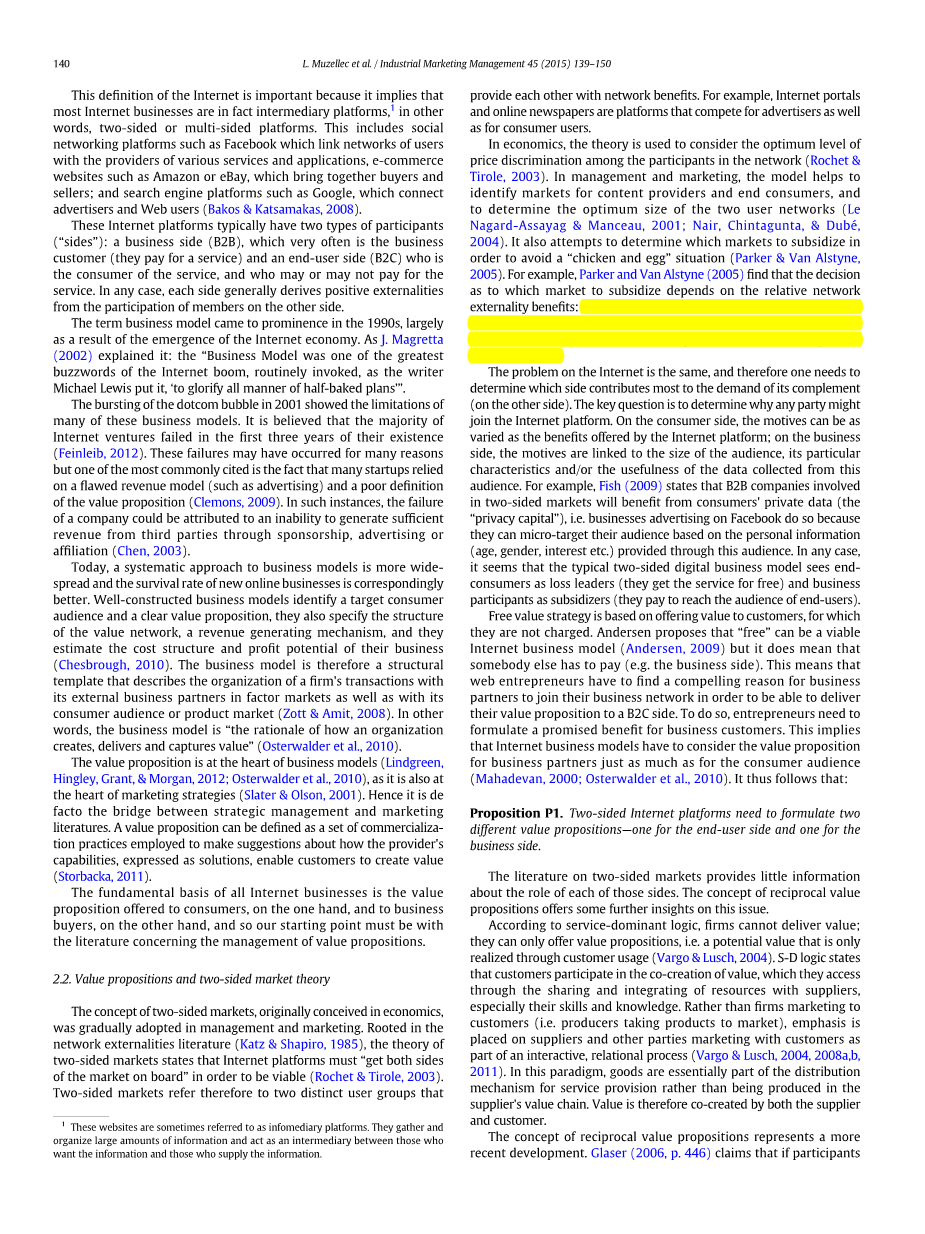 总之,文献价值互惠的命题是商业客户和消费者的价值主张的共同创造者在双边市场文献建议,消费者增加了额外的复杂性(互联网用户)可能是倒数的B2B交易主体而不是共同创造的接受者。然而,随着时间的推移,在互联网企业的业务建模过程中无论领域提供了多么足够的信息了解业务客户和供应商的角色,但是商业模式的生态系统提供了随时间变化作为一种概念化的价值共同创造的复杂性质等额外的见解。