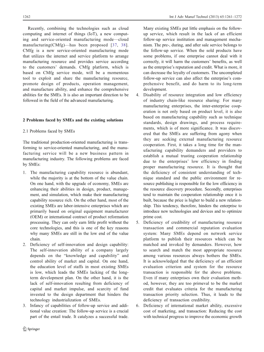 制造业信息化有20多年的历史。在过去的二十年里,许多知名的制造模式和技术被提出来,如电脑集成制造(CIM)、敏捷制造(AM)、并行工程(CE)、网络化制造(nm),应用服务提供商(ASP)、虚拟制造(VM)、全球制造环,动态联盟(DA),工业产品服务系统(IPS2),制造网格(MGrid)等。然而,由于中小企业在上述模式中对信息使用不足导致制造业的信息化进程已经遇到瓶颈。由于缺乏开放的架构,共同的标准和规范培训,没有实现智能嵌入式访问底层物理制造资源以及作为制造资源和能力服务封装,上述制造模式的应用和发展受到阻碍。最近,通过结合新型技术比如云计算、物联网(IOT),一个新的计算和面向服务的制造模式的云制造(CMFG)已经被提出[37,38]。云制造是一种新的服务型制造模式,它利用互联网和服务平台根据客户的需求分配制造资源并提供服务。云制造平台,是基于云制造服务模式,将是开发和共享制造资源,促进产品设计、运营管理、制造能力,提高中小企业的综合能力一个重要的工具。同时它是先进制造业的重要方向。