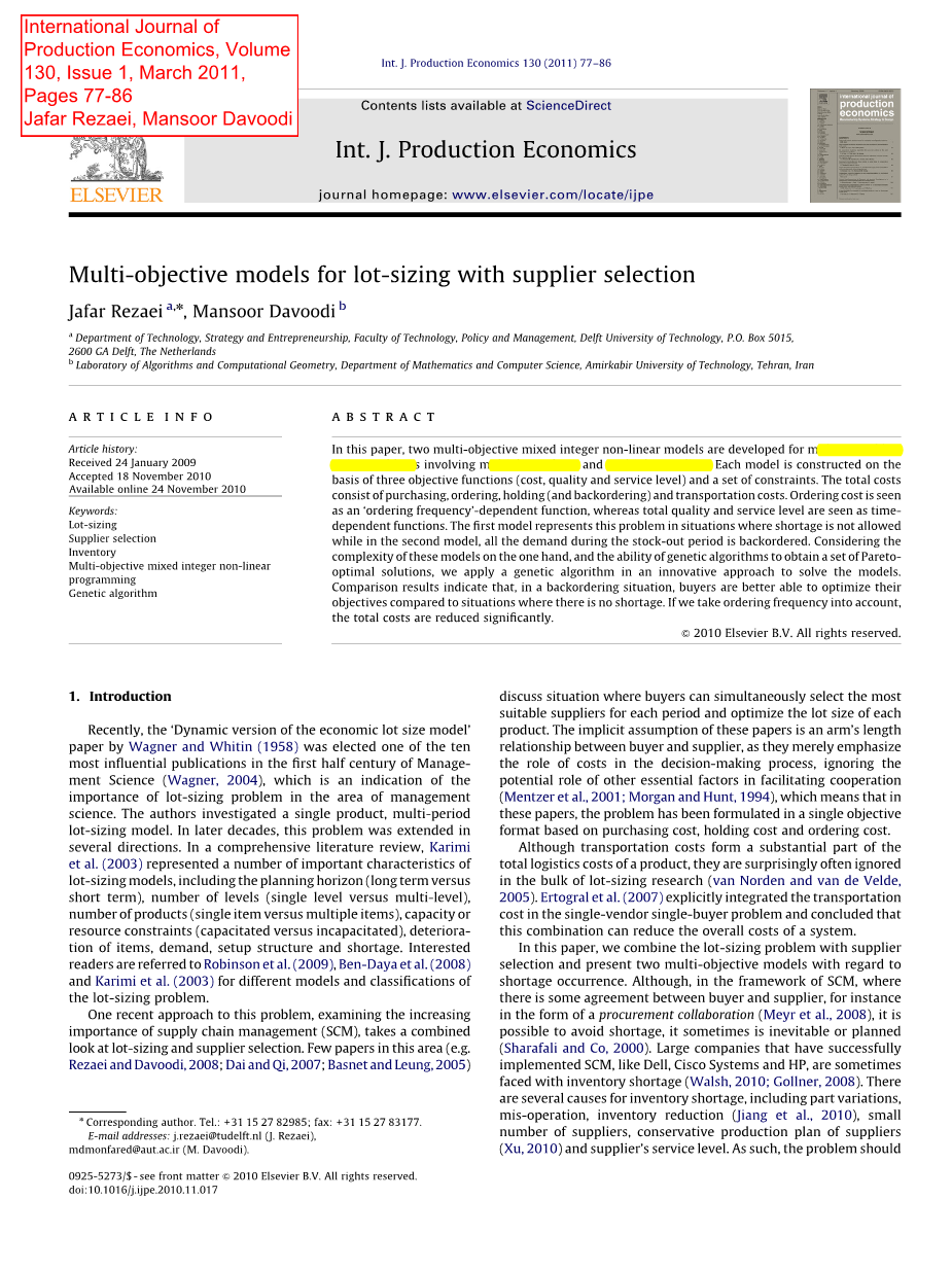 关键词:批量计划、供应商选择、库存、多目标混合整数非线性规划、规划、遗传算法