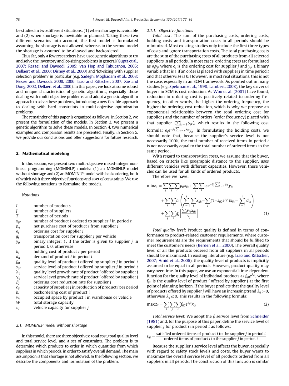 在本文中,我们将结合批量问题与供应商选择,展示两种关于发生短缺的多目标模型。虽然在供应链管理的框架中,买方和供应商之间存在一些协议,例如采购合作的形式(Meyr et al .,2008),可以避免短缺,但它有时是不可避免或计划的(Sharafali和Co,2000)。大公司已经成功地实现供应链管理,如戴尔、思科和惠普,但有时仍会面对库存短缺(Walsh,2010;Gollner,2008)。库存短缺有几个原因,包括零件差异,误操作,库存减少(Jiang et al .,2010),供应商数量少,供应商保守的生产计划(Xu,2010)和供应商的服务水平。因此,应该在两种不同的情况下研究这个问题: (1)当短缺是可以避免的和(2)当不可避免或计划短缺时。考虑到这两个不同的场景,第一个模型被假定为不允许短缺,而第二个模型被假定为允许短缺和缺货。