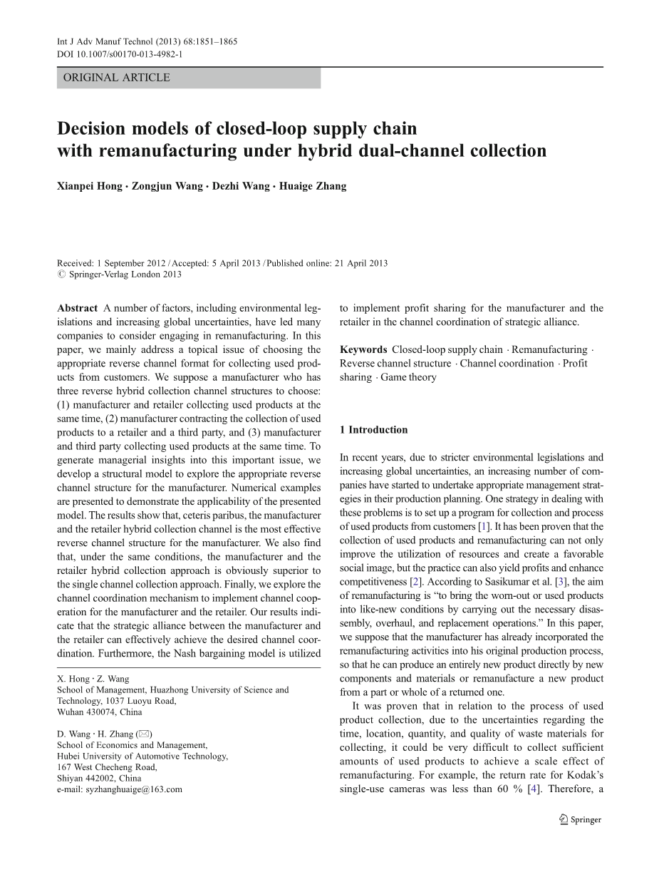 关键词:闭环供应链;再制造;逆向供应链结构;渠道协调;利润共享;博弈论