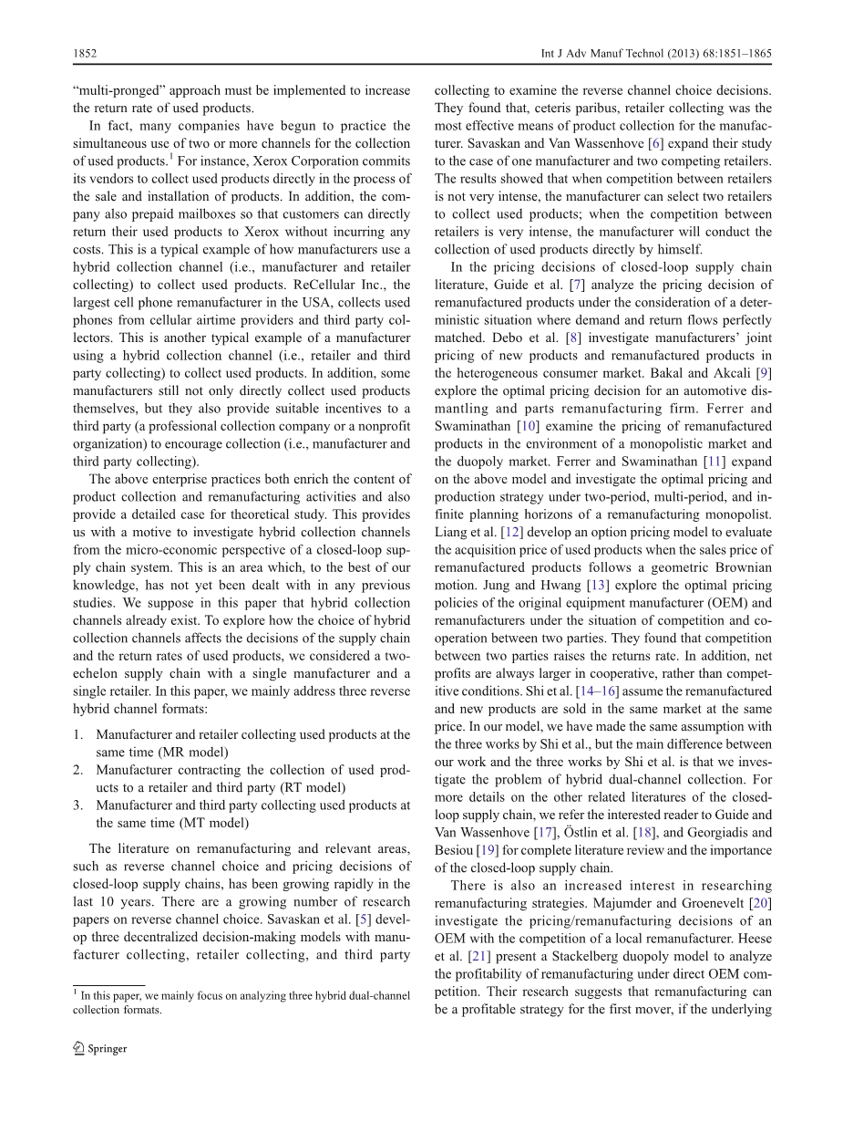事实上,许多企业已经开始同时使用两个或多个渠道来回收二手产品(本文中我们主要研究三种混合双渠道回收模式)。如施乐公司承诺其供应商可以直接在产品销售和安装过程中回收二手产品。此外,企业也预先设置了回收点让消费者可直接将他们的二手产品回收给施乐而不产生任何费用。这是一个有关于制造商如何通过混合回收渠道(比如制造商和零售商同时回收)来回收二手产品的最典型的例子。ReCellular Inc是美国最大的手机再制造商,它从蜂窝通话时间提供商和第三方回收商手中回收二手手机。这是另一个有关于制造商如何通过混合回收渠道(比如零售商和第三方同时回收)来回收二手产品的最典型的例子。另外,一些制造商仍然不仅自己直接回收二手产品,还委托激励第三方(专业回收企业或者是非营利性组织)来回收(比如制造商和第三方回收)。