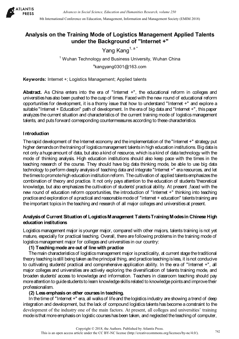 [1] F. Meng, Research on Talents Training Mode of Applied Logistics Management, 2014