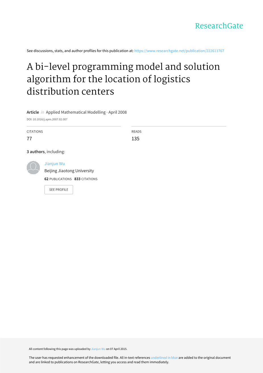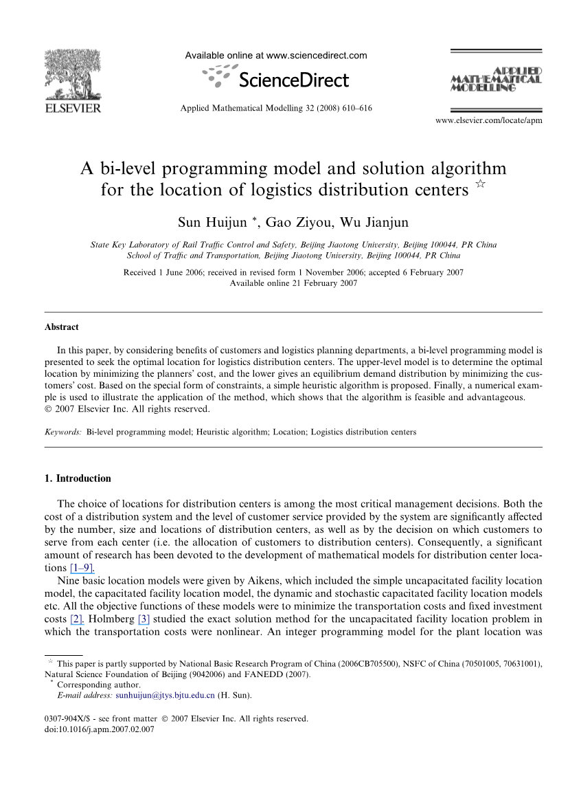 显然,物流配送中心的位置问题可以表现为领导者或者stackelberg游戏,决策管理者是领导者,客户是追随者自由选择配送中心。因此,它适合代表位置问题双层编程模型。然而,虽然设施位置问题已经被广泛研究了已经非常少的关注使用双层编程模型来模拟位置问题。 Tanig-uchi [11]开发了一个双层模型,以确定公共物流终端的最佳大小和位置。该模型的上层描述了计划者的行为,以最小化总成本,运输成本(线路运输和提货/运输成本)和设施投资成本。较低的水平是确定卡车和乘用车的用户平衡分配公路物流终端候选地的任何地点模式下的道路网络。该模型直接采用遗传算法作为解决方案。但是,位置位置的影响客户需求分配(响应函数形式)未得到准确分析。无论是accu-双层次的速率响应函数(上位变量与低级变量的变异关系)获得的模型是否对有效的算法至关重要。在本文中,我们打算给出一个启发式算法 - 通过使用简单的方法估计响应函数,这是基于con的特殊形式双层位置模型的压力。