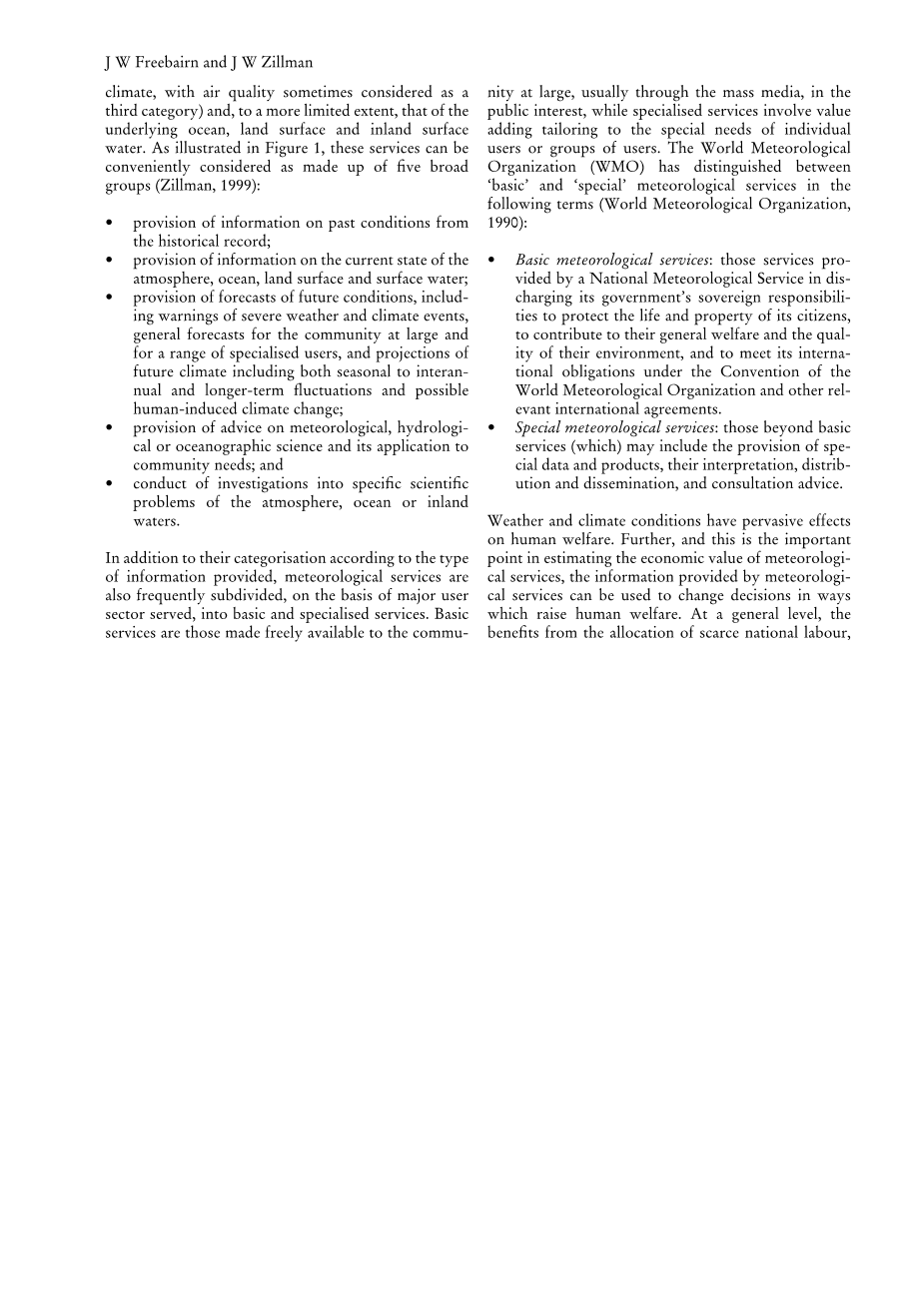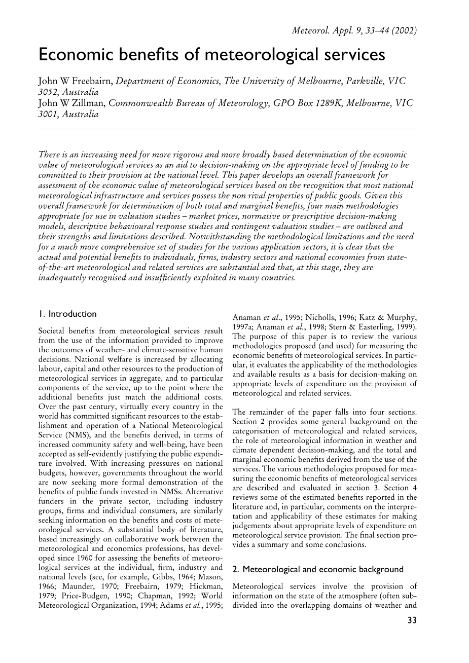 气象服务涉及到提供关于大气状况的信息(经常细分进入天气和重叠的领域Meteorol。申请9,33-44(2002)气象服务的经济效益。墨尔本大学,维多利亚州立大学维多利亚州立大学经济系John W Freebairn澳大利亚3052英联邦气象局的John W Zillman,GPO Box 1289K,Melbourne,VIC3001,澳大利亚越来越需要更严格和更广泛地确定经济气象服务的价值作为对适当的资金来源的决策的帮助承诺在国家一级提供。本文制定了一个总体框架基于大多数国家认可的气象服务经济价值评估气象基础设施和服务具有公共物品的非竞争性。鉴于此确定总和边际效益的总体框架,四个主要方法适用于估值研究 - 市场价格,规范性或规范性决策模型,描述性行为反应研究和或有估值研究 - 概述和他们的优势和限制描述。尽管有方法上的限制和需要对于各种应用领域的更全面的研究,很明显个人,企业,行业和国家经济对国有企业的实际和潜在利益,最先进的气象和相关服务是巨大的,在这个阶段,他们是许多国家没有得到充分认可和充分利用。气候,空气质量有时被认为是