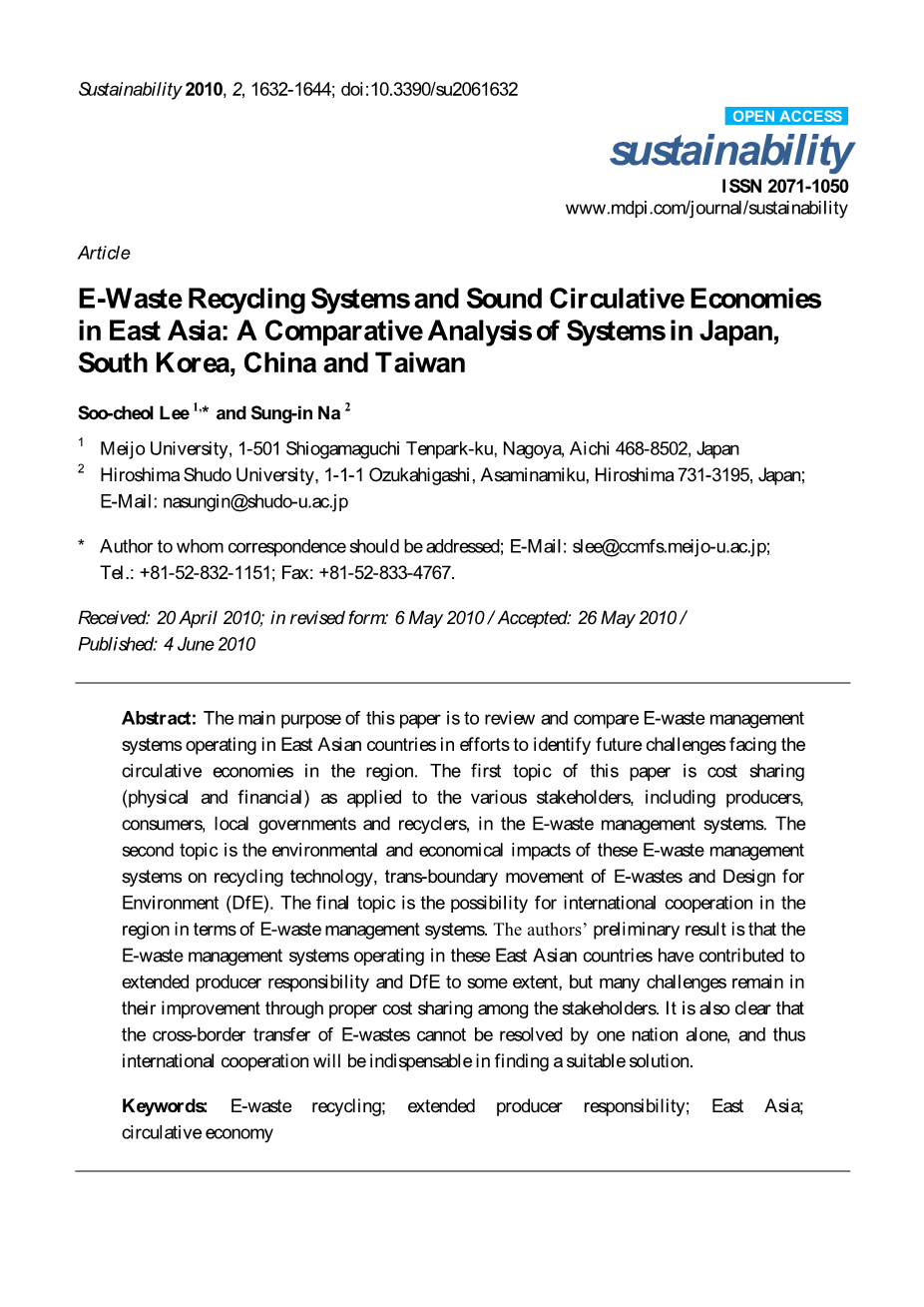 Abstract: The main purpose of this paper is to review and compare E-waste management systems operating in East Asian countries in efforts to identify future challenges facing the circulative economies in the region. The first topic of this paper is cost sharing (physical and financial) as applied to the various stakeholders, including producers, consumers, local governments and recyclers, in the E-waste management systems. The second topic is the environmental and economical impacts of these E-waste management systems on recycling technology, trans-boundary movement of E-wastes and Design for Environment (DfE). The final topic is the possibility for international cooperation in the region in terms of E-waste management systems. The authorsrsquo; preliminary result is that the E-waste management systems operating in these East Asian countries have contributed to extended producer responsibility and DfE to some extent, but many challenges remain in their improvement through proper cost sharing among the stakeholders. It is also clear that the cross-border transfer of E-wastes cannot be resolved by one nation alone, and thus international cooperation will be indispensable in finding a suitable solution.