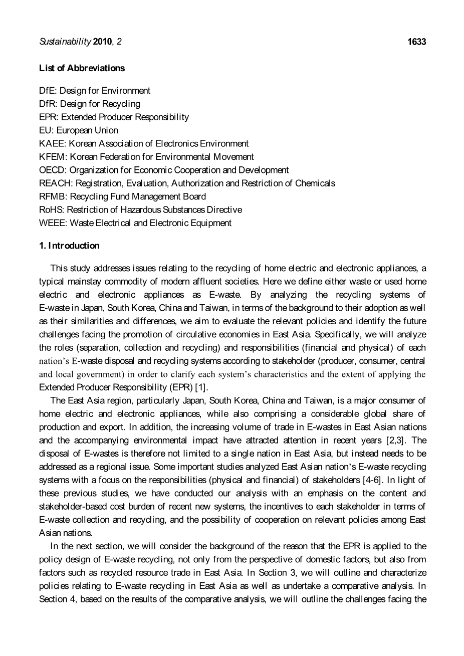 本研究涉及与回收家用电器和电子电器有关的问题,这是现代社会的典型的支柱商品。在这里,我们定义报废的家庭电器和电子设备为电子废物。本文通过对日本、韩国、中国大陆和中国台湾地区电子废弃物回收利用的背景分析,从其采取各措施的背景及其异同的角度,对相关政策进行评价,并找出促进东亚循环经济发展过程中,所面临的挑战。具体而言,我们将根据利益相关方:生产者、消费者、中央和地方政府,来分析每个地区的废物处理和回收系统的作用(分离、收集和回收)和责任(财政和物理) ,以明晰每个系统的特点和适用扩大生产者责任的范围。[[1]]