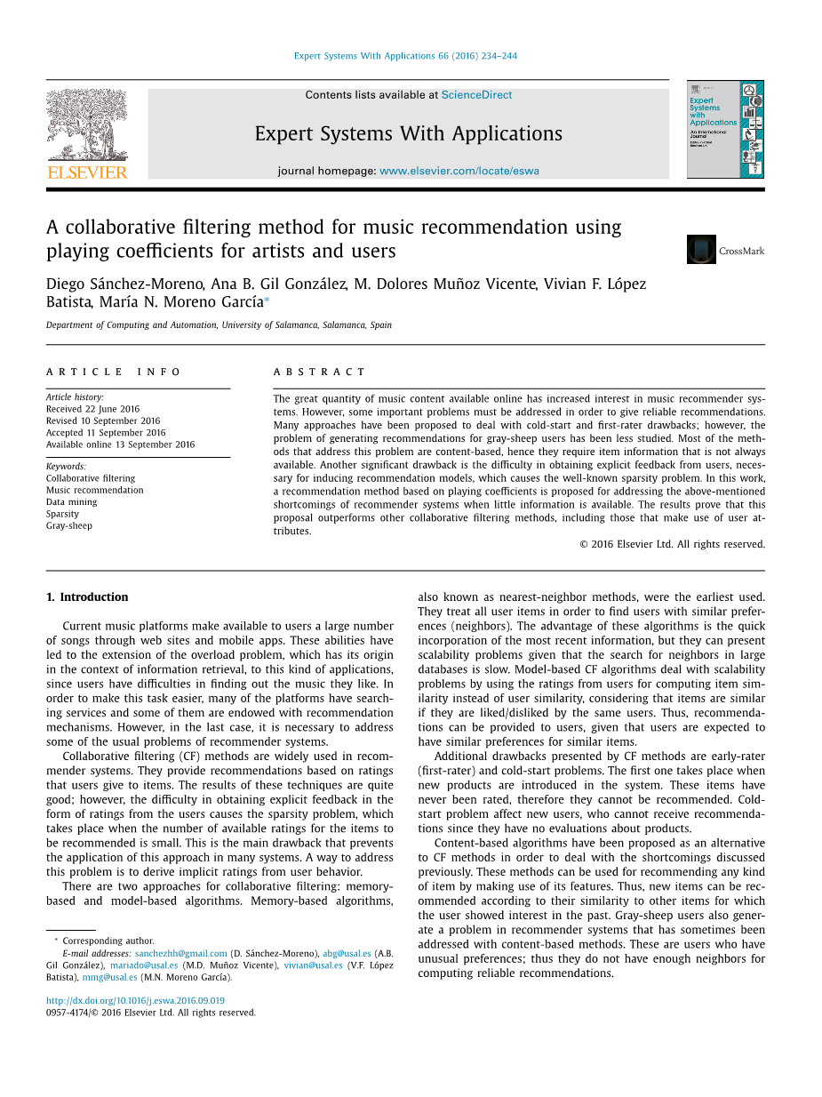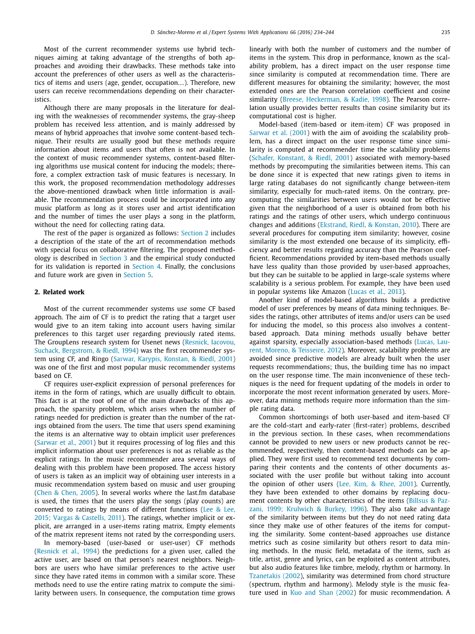 大多数当前的推荐系统使用基于协同过滤的方法。协同过滤的目的是预测目标用户对项目的评级,同时考虑到与此目标用户具有与先前评估的项目相似的偏好的用户。Usenet新闻集团研究系统(Resnick,Iacovou,Suchack,Bergstrom,&Riedl,1994)是第一个使用协同过滤推荐系统的平台,Ringo(Sarwar,Karypis,Konstan,&Riedl,2001)是最受欢迎的基于协同过滤的音乐推荐系统。