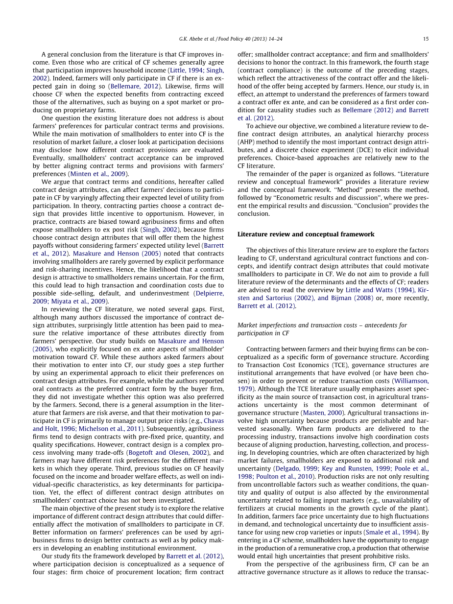 这篇文献综述的目的是探索导致订单农业产生的因素,理解农业合同的功能和概念,以及确定可以激励小农参与订单农业的合同设计属性。 我们不旨在提供导致订单农业产生的决定因素和影响订单农业发展的完整文献综述;建议读者阅读Little和Watts(1994),Kirsten和Sartorius(2002)和Bijman(2008)或最近的Barrett等人的概述(2012)。