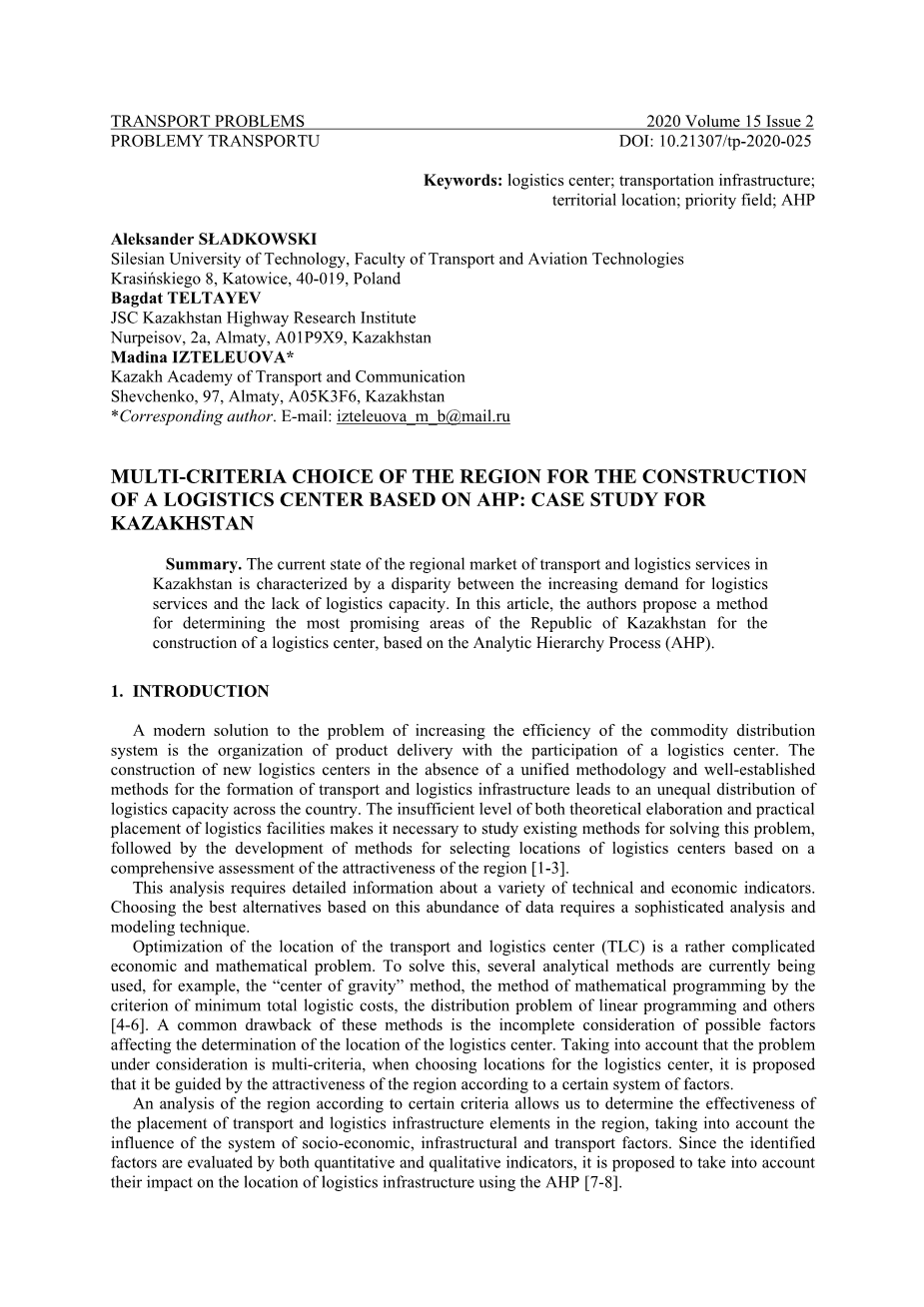 基于AHP的物流中心建设区域的多标准选择:哈萨克斯坦的案例研究