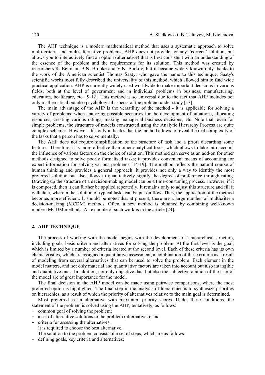 AHP技术是一种现代数学方法,它使用一种系统的方法来解决多标准和多选择的问题。AHP不提供任何'正确'的解决方案,但允许你以互动的方式找到一个最符合对问题本质的理解和对其解决方案的要求的选项(备选)。这种方法是由研究人员R.Bellman、B.N.Brooke和V.N. Burkov创造的,但只有在美国科学家Thomas Saaty的工作下才广为人知,他为这种技术命名。萨蒂的科学作品最充分地描述了这种方法的普遍性,这使他能够找到广泛的实际应用。目前,AHP在世界范围内被广泛用于各个领域的重要决策,包括政府层面和商业、制造业、教育、医疗等领域的个人问题。[9-12]这种方法之所以如此普遍,是因为AHP不仅包括数学方面,还包括所研究问题的心理学方面[13]。