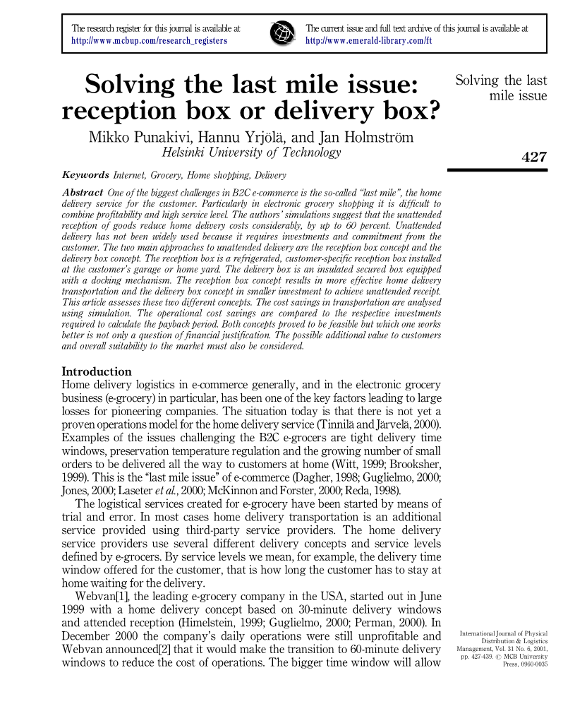 作为开发无人值守接收解决方案的先驱,流线型公司不得不关闭业务,因为它无法产生所需的数量来证明投资的合理性(彼帕,2000;纳斯达克,2000)。其中很大一部分投资用于消费者车库的固定接收箱。因此,尽管特定于客户的接收箱能够为客户提供增值服务,如供应商管理的库存和电子杂货商送货上门操作的有可观的成本节约,但接收箱所涉及的投资非常高(斯马罗斯和霍姆斯特罗姆,2000;斯马罗斯等,2001;费雷,1999)。问题是,基于接收箱的操作理念导致增长率较低,因为为新客户安装接收箱的成本低且速度慢。从这个意义上说,对于一家致力于电子商务市场快速增长的公司来说,有人等待收货的经营理念会更好。另一方面,在满足重复性采购客户和稳定的货物需求时,无人值守接收更好。
