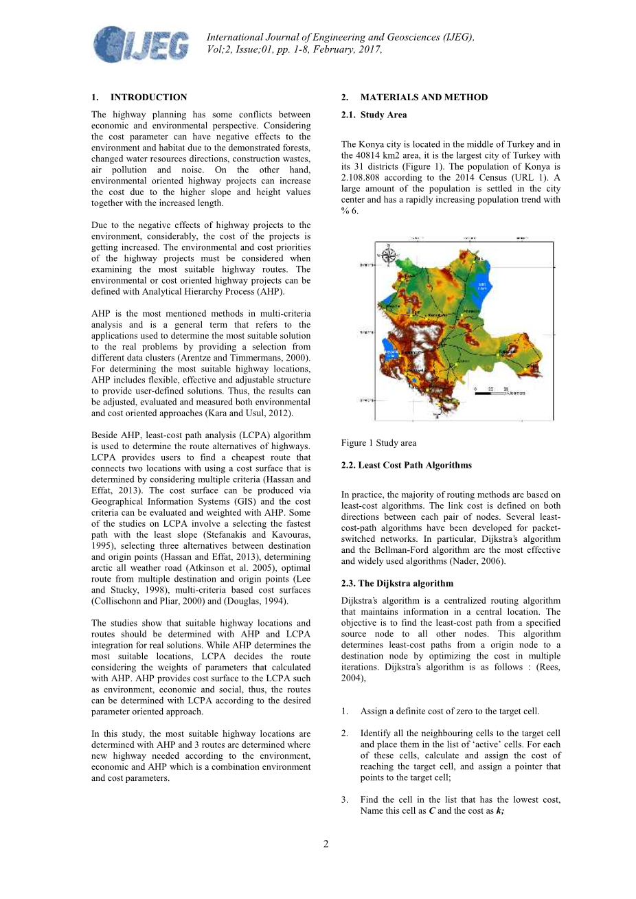 除层次分析法外,利用最小成本路径分析(LCPA)算法确定高速公路的路径选择。LCPA为用户提供了一条最便宜的路线,该路线通过考虑多种标准确定的成本面连接两个地点(Hassan和Effat,2013)。成本面可以通过地理信息系统(GIS)生成,成本准则可以通过层次分析法进行评价和加权。有关LCPA的一些研究涉及选择坡度最小的最快路径(Stefanakis和Kavouras,1995),在目的地和起点之间选择三个备选方案(Hassan和Effat,2013),确定北极全天候道路(Atkinson等人,2005)、从多个目的地和起点出发的最佳路线(Lee和Stucky,1998)、基于多标准的成本曲面(Collishonn和Onber,2000)和(Douglas,1994)。