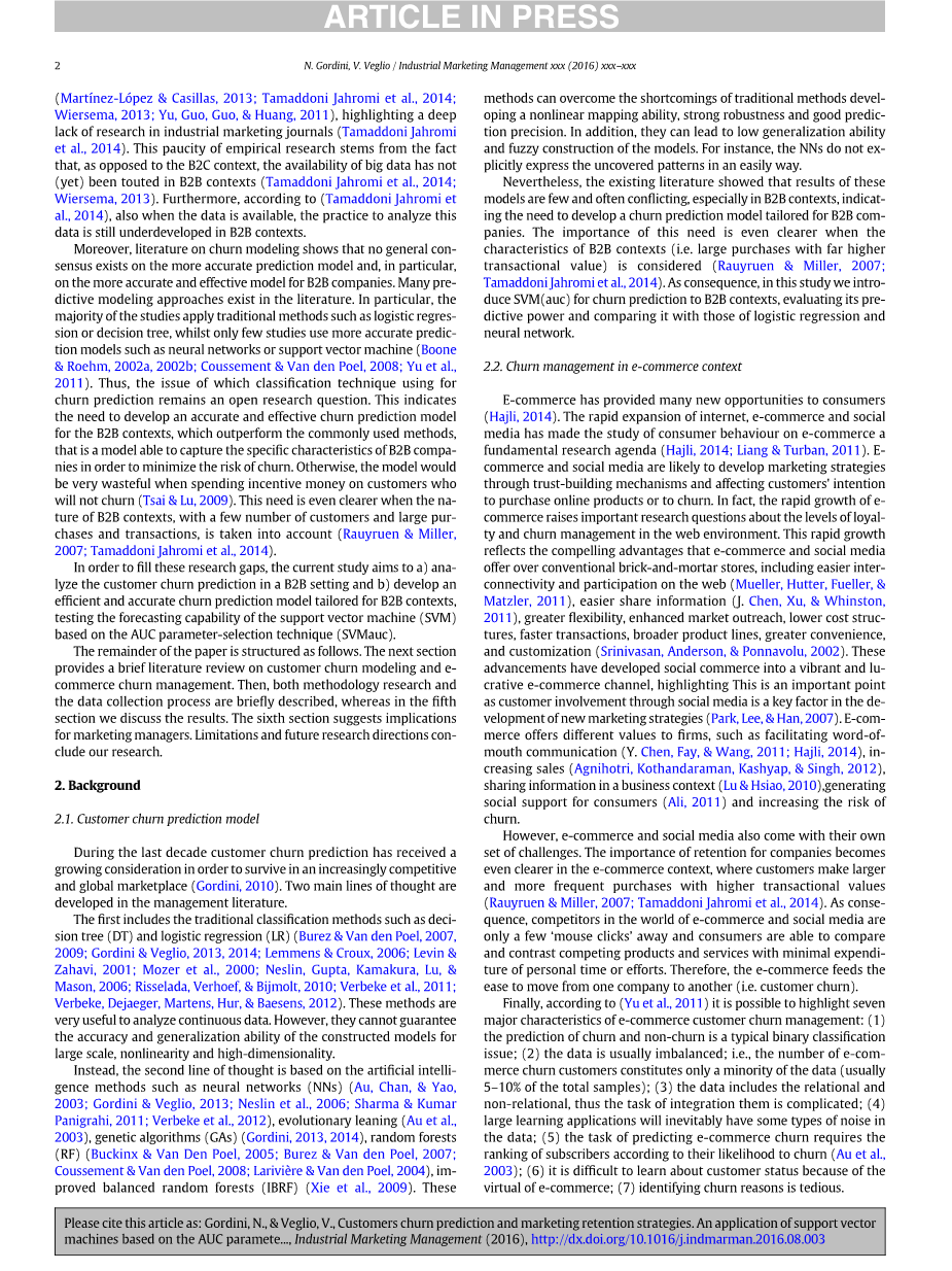 为了填补这些研究空白,目前的研究针对:(a)分析B2B环境下的客户流失预测;(b)针对B2B环境开发一个高效且准确的客户流失预测模型,测试基于AUC参数选择技术(SVMauc)的支持向量机(SVM)的预测能力。