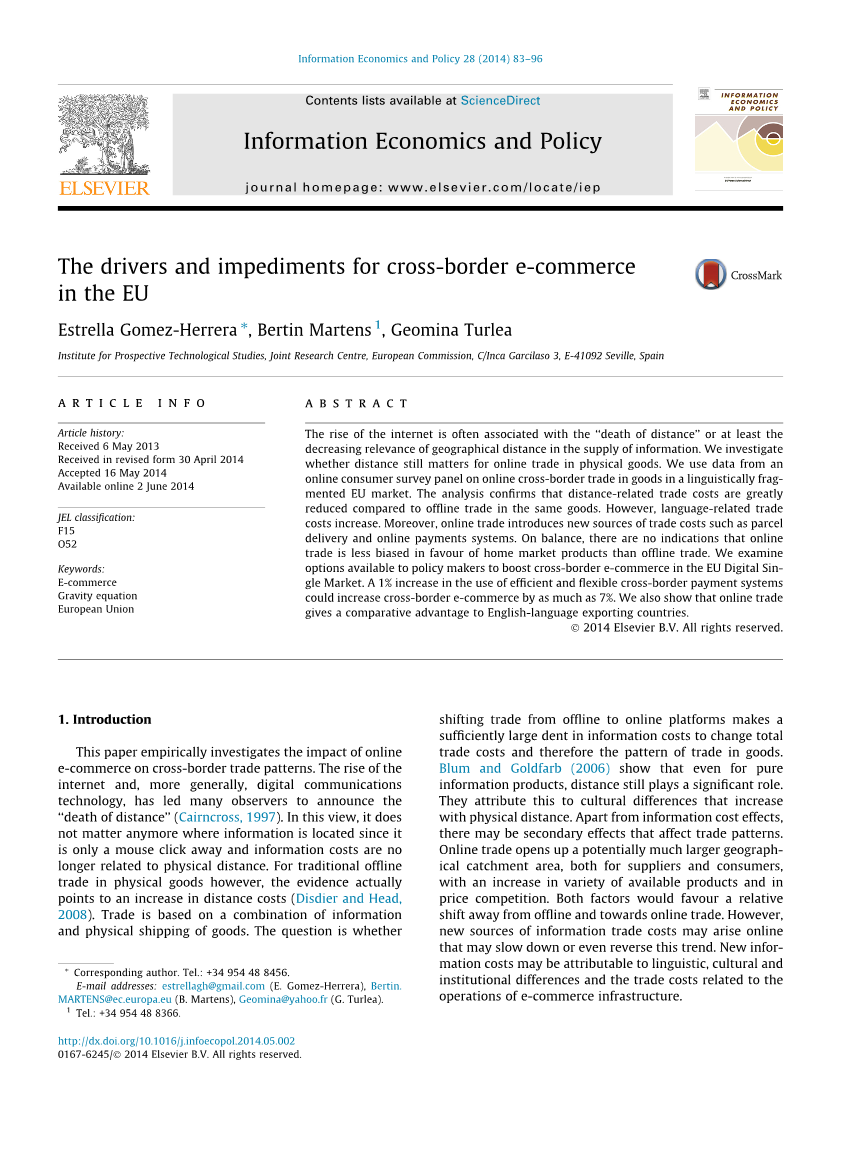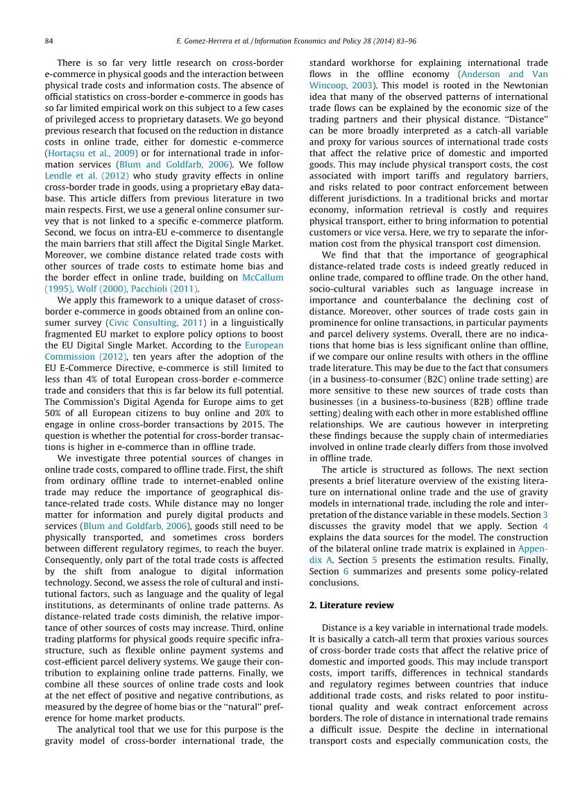 迄今为止,对实体商品的跨境电子商务以及对实体贸易成本与信息成本之间的相互作用的研究很少。由于对货物跨境电子商务的官方统计数据的缺乏,目前已经限制了在少数特权获取专有数据库的情况下工作的开展。我们超越了以前的研究,重点聚焦在国内电子商务(Hortacsu等人, 2009)或国际信息服务贸易(Blum和Goldfarb, 2006)中,在线交易中减少距离成本。我们遵循Lendle等人使用专有的eBay数据库研究在线跨境货物贸易中的重力效应。本文与以前的文献有两个主要不同的方面。首先,我们使用的是一个不与特定电子商务平台相关联的一般在线消费者调查。其次,我们关注的是欧盟内部电子商务,以消除仍然影响数字单一市场的主要壁垒。此外,基于McCallum (1995)、Wolf (2000)、Pacchioli (2011)等人的研究,我们结合距离相关的贸易成本与其他贸易成本来评估本土偏好和在线交易的边缘效应。